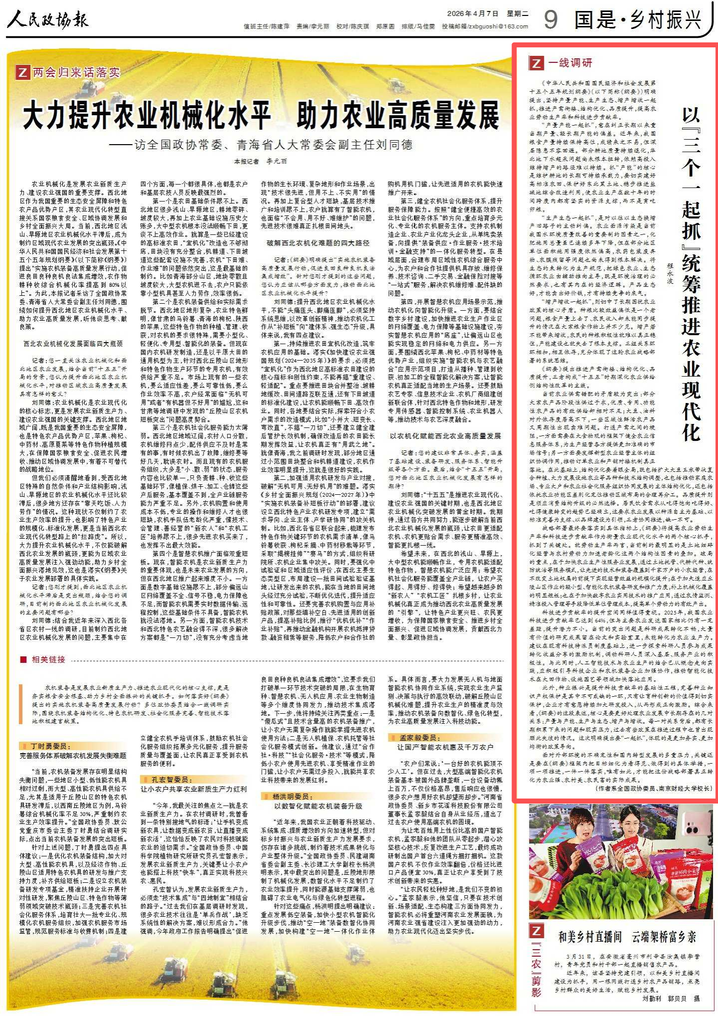 “十五五”规划纲要明确提出,坚持产量产能、生产生态、增产增收一起抓,推进产需衔接、结构优化、品质提升,提高农业劳动生产率和科技进步贡献率。4月7日,《人民政协报》刊发程永波校长署名文章《以“三个一起抓”统筹推进农业现代化》。